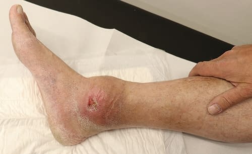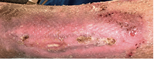 Die initiale Vorstellung in unserer Klinik erfolgte aufgrund chronischer Ulzerationen an beiden Unterschenkeln bedingt durch eine chronisch venöse Insuffizienz.