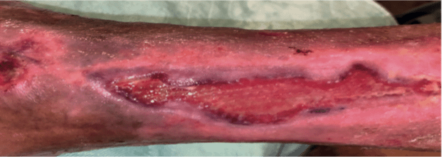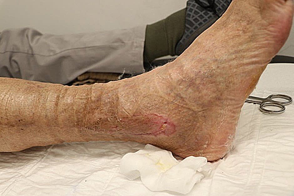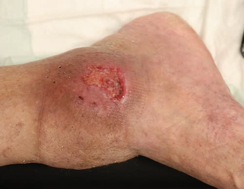 Aufgrund eines Weichteildefektes am rechten Unterschenkel war bei dem Patienten eine Weichteilrekonstruktion mit einer freien Lappenplastik durchgeführt worden. Im postoperativen Verlauf kam es infolge eines Druckschadens zu einer Ulzeration, die operativ saniert und mit einem Spalthauttransplantat versorgt wurde.