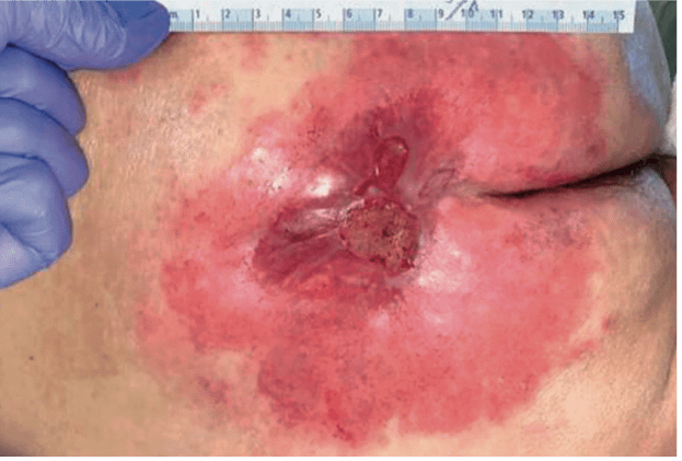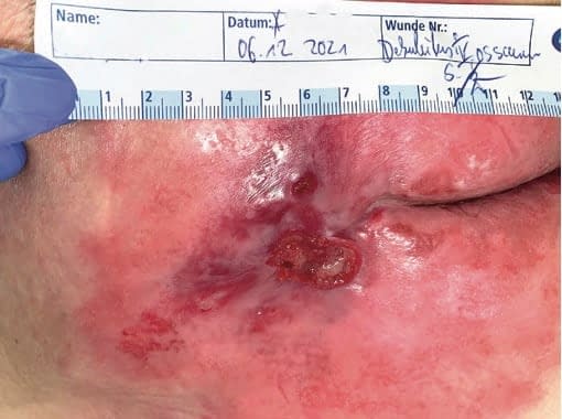 Aufgrund der enormen Verbesserung der Wundsituation nach Kaltplasma-Anwendung konnten wir letztlich auf weitere Wunddebridements und eine anschließende aufwendige Rekonstruktion des Weichteildefektes mit einer freien Lappenplastik bei dem alten Patienten verzichten. Trotz freiliegender knöcherner Anteile zeigte die Wunde nach Kaltplasma-Anwendung eine gute Granulationstendenz (Abb. 4).