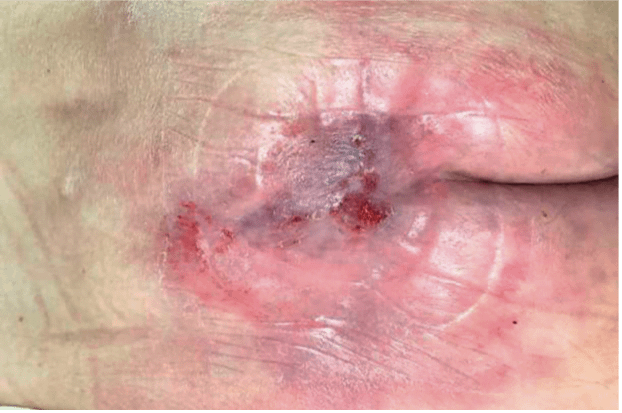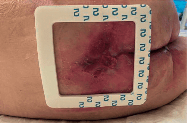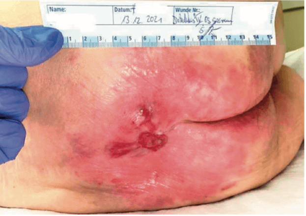Der 56-jährige, männliche Patient wurde in einer Rehaklinik versorgt. Bei ihm besteht ein langjähriges Alkohol- und Drogenproblem. Daraus resultierte u.a. ein geschwächter Immunstatus sowie ein fehlendes Krankenverständnis. Er ist vollständig immobil, da aufgrund einer pAVK beide Beine amputiert werden mussten (Bein re. 1/2021, Bein li. 3/2021). Die Wundbehandlung erfolgte mechanisch. Die täglichen Verbandwechsel wurden mit Saugkompressen und Fixierpflaster durchgeführt. Eine Bewegungsförderung fand mit Unterstützung der nötigen Hilfsmittel statt. Die Lagerung erfolgte auf dem Umpositionierungssystem TOTO-Frontier Medical.