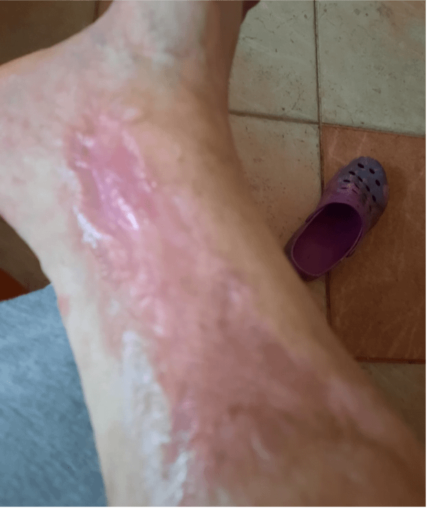 Es erfolgte zunächst eine operative Wundversorgung mit einem Wund-Debridement sowie eine anschließende Defektdeckung der Weichteildefekte mit einem Spalthauttransplantat. Die Patientin wurde mit nahezu vollständig eingeheilten Spalthauttransplantaten aus der stationären Behandlung entlassen.