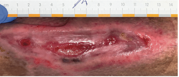 Über zwei Monate hinweg erfolgte eine regelmäßige (initial min. 1 x/wöchentlich) Kaltplasma-Behandlung der Wunde.