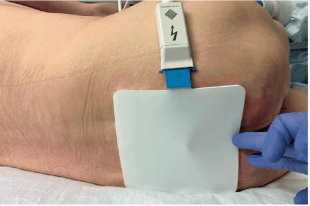 Das CPT®patch aus atraumatischem Material wird auf dem Dekubitus platziert und mit dem CPTcube verbunden. Der Finger drückt auf die Rima ani, um eine geschlossene Kammer zu gewährleisten, damit das Kaltplasma voll zum Einsatz kommen und nicht entweichen kann. Es erzeugt nach dem Anschalten ein flächiges, kaltes Atmosphärendruck-Plasma zur Wundheilungsförderung auch lokal infizierter Gewebedefekte. Sogar multiresistente Keime werden abgetötet. Die Behandlung ist für den Patienten schmerzfrei und nach 2 Minuten abgeschlossen. Zur Sicherheit geht das CPT-Gerät nach der festgelegten Behandlungszeit automatisch in den Bereitschaftsmodus zurück. Eine „Überdosierung“ kann so sicher ausgeschlossen werden.
